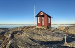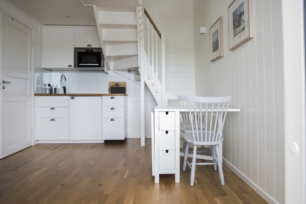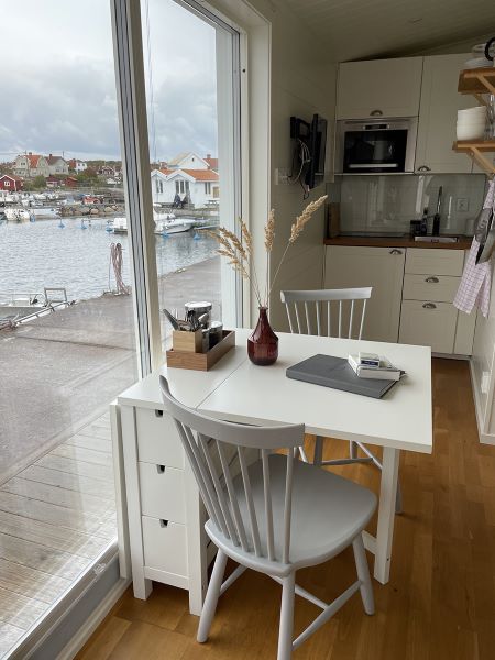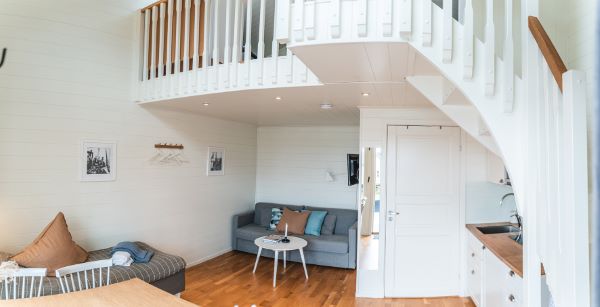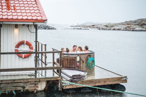 Här bor ni i sjöbodar på kajen, med vågornas kluckande som närmaste granne och naturen utanför dörren. I varje sjöbod finns dusch, toalett samt pentry för självhushåll.